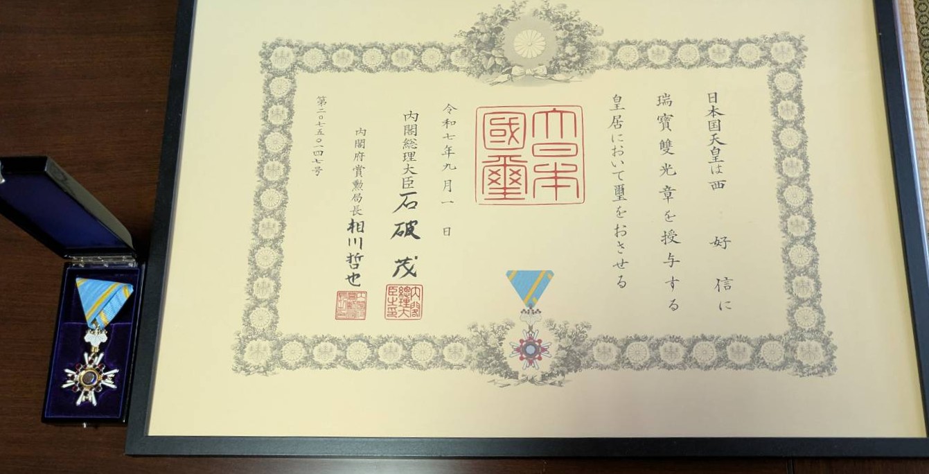 令和7年9月1日 当支部所属の 西 好信様 は「瑞寳雙光章」を授与されました。